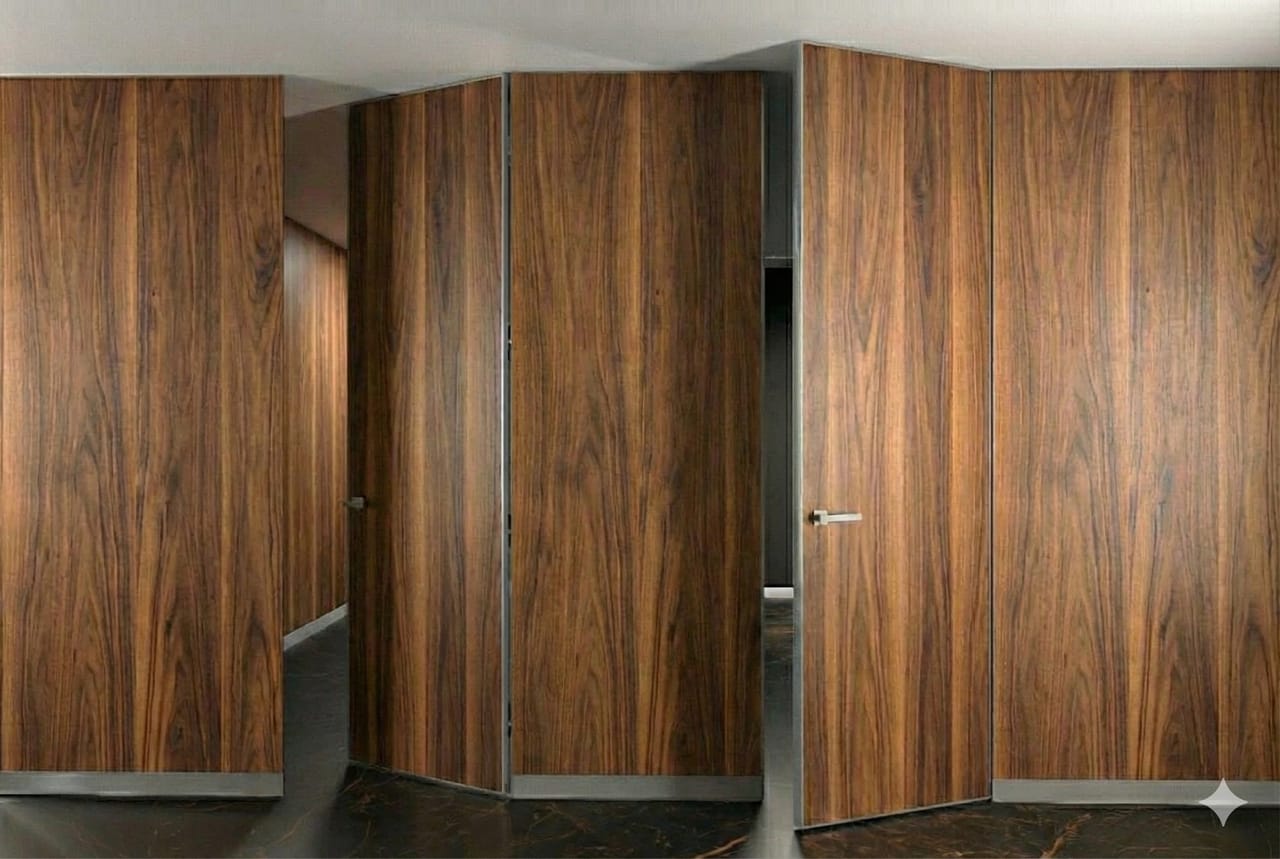 Дверний блок Axiomadoors прихованого монтажу з комбінованим покриттям HPL з одного боку та Срібним дзеркалом з іншого — стильне та практичне рішення для сучасних інтер’єрів у мінімалістичному, хай-тек або лофт стилі. Безрамна конструкція монтується врівень зі стіною, створюючи ефект «невидимих дверей» та підкреслюючи чистоту архітектурних ліній.