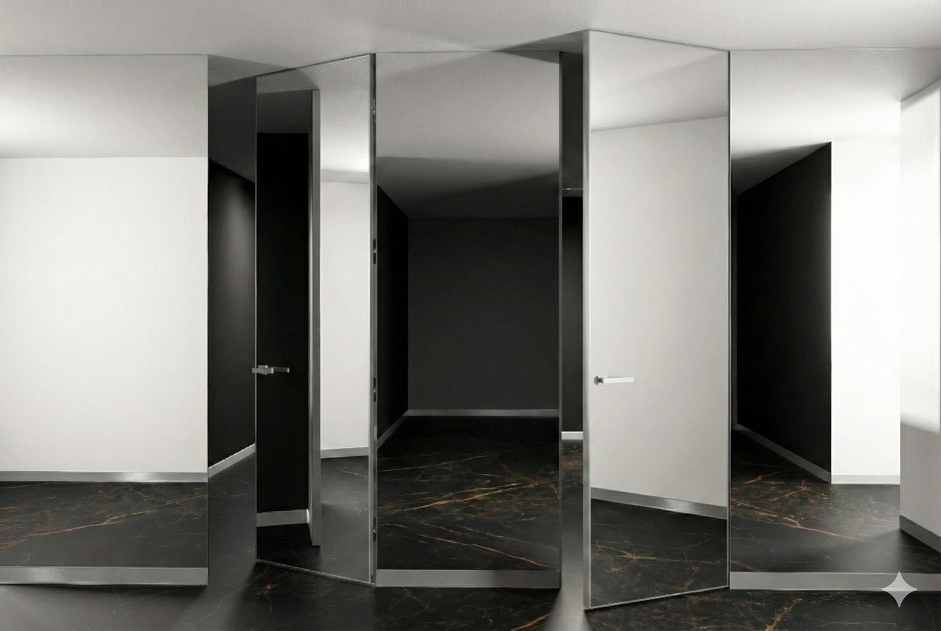 З одного боку дверне полотно виконане у покритті Дзеркало Графіт (або Срібне дзеркало), що візуально розширює простір та додає інтер’єру глибини. З іншого боку — МДФ під фарбування, що дозволяє пофарбувати двері в колір стін або поклеїти шпалери для повної інтеграції в дизайн приміщення.